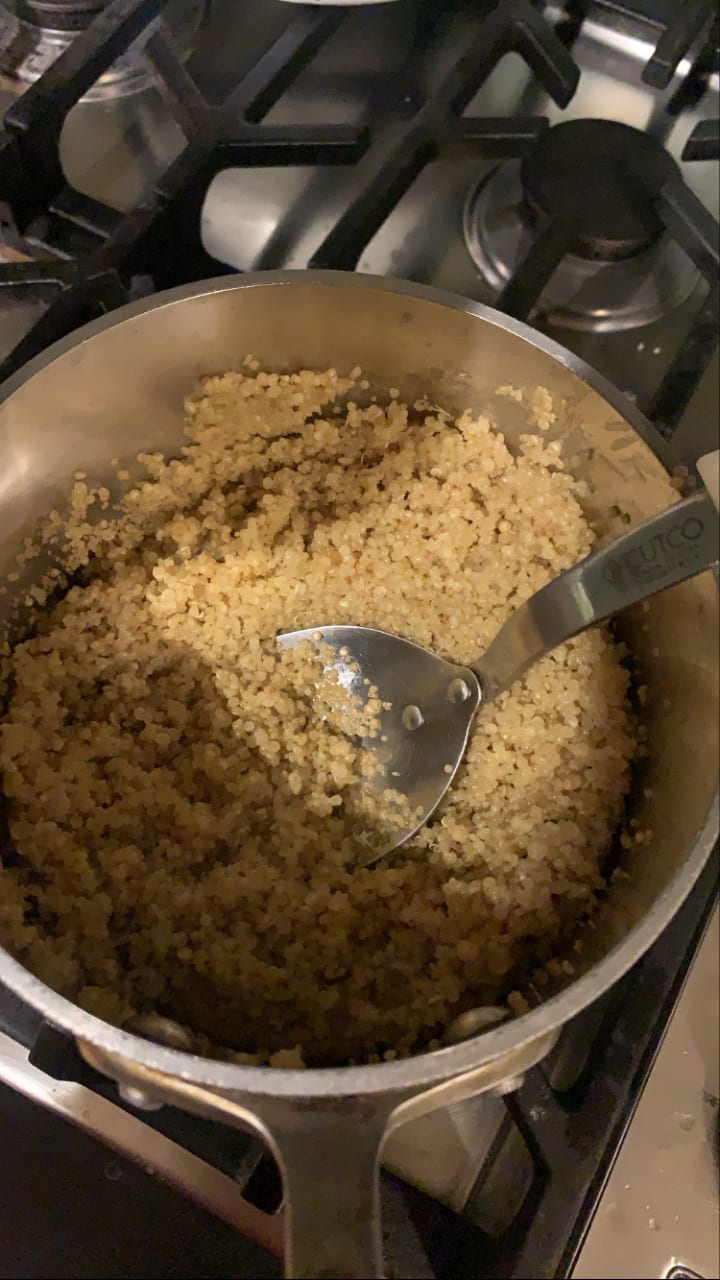 This is the first step of the meal as it will take the longest. Add water, quinoa, bring to boil, then simmer for about 45 minutes.