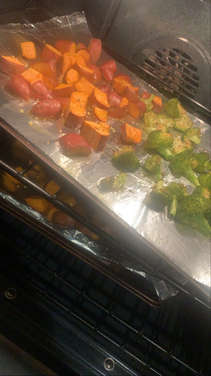 I washed the vegetables well and cut off any brown parts (I love washing my food with my hands and establishing a real tactile connection to each item). Then I chopped them into medium size pieces. I seasoned the potatoes and broccoli with olive oil, garlic & herb mix, and some salt and pepper too. Set the oven to 400 and leave them in for about 25 minutes or until cooked to your liking! I prefer my oven baked broccoli a little crispy, but not *too* crispy.