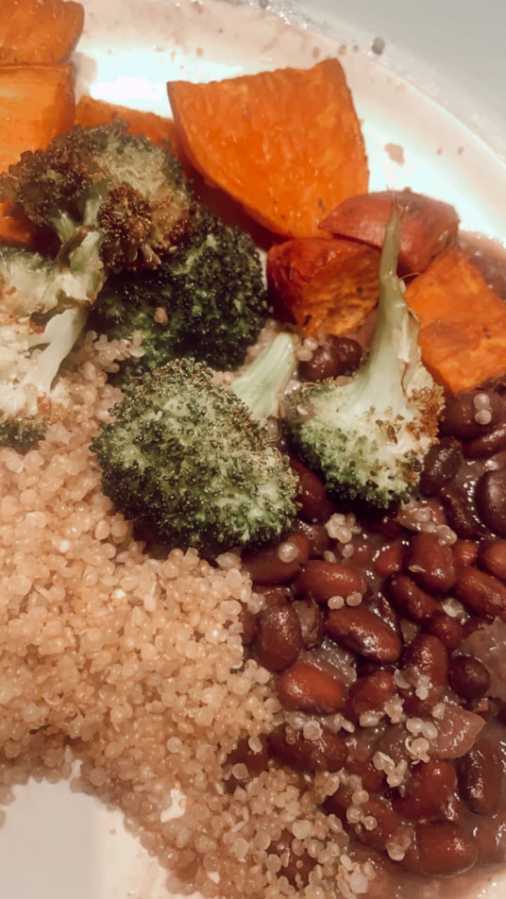 I researched which foods pack the most of your daily value % of iron and contain at least some magnesium. I decided to create a meal that would combine some things that I also happened to already have in my house! The resulting meal: Roasted broccoli and sweet potato over quinoa and black beans. The best part of this meal is that it all came together in about 25 minutes. Not only healthy and balanced but quick & easy too! This is my kind of meal.