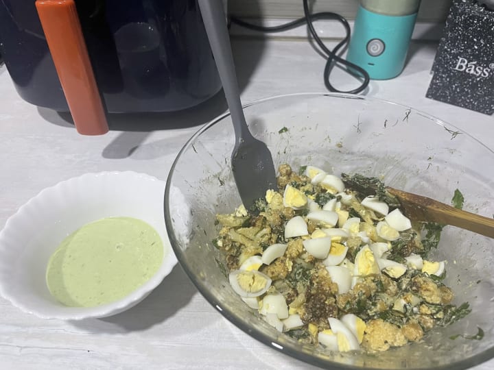 7. Add parsley, dill, and eggs. This is how it looked before the last step on my prep table, next to the air fryer and the personal travel blender I used, still with half of the dressing in it.