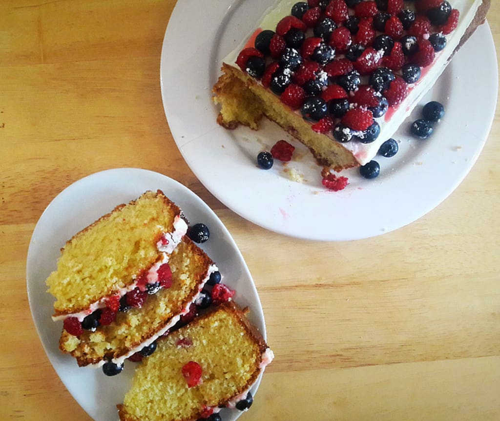 - When the loaf has completely cooled down, start to cream the top of the loaf with a thin layer of frosting. Finish off the bake with raspberries and blueberries on top that covers the the frosting.