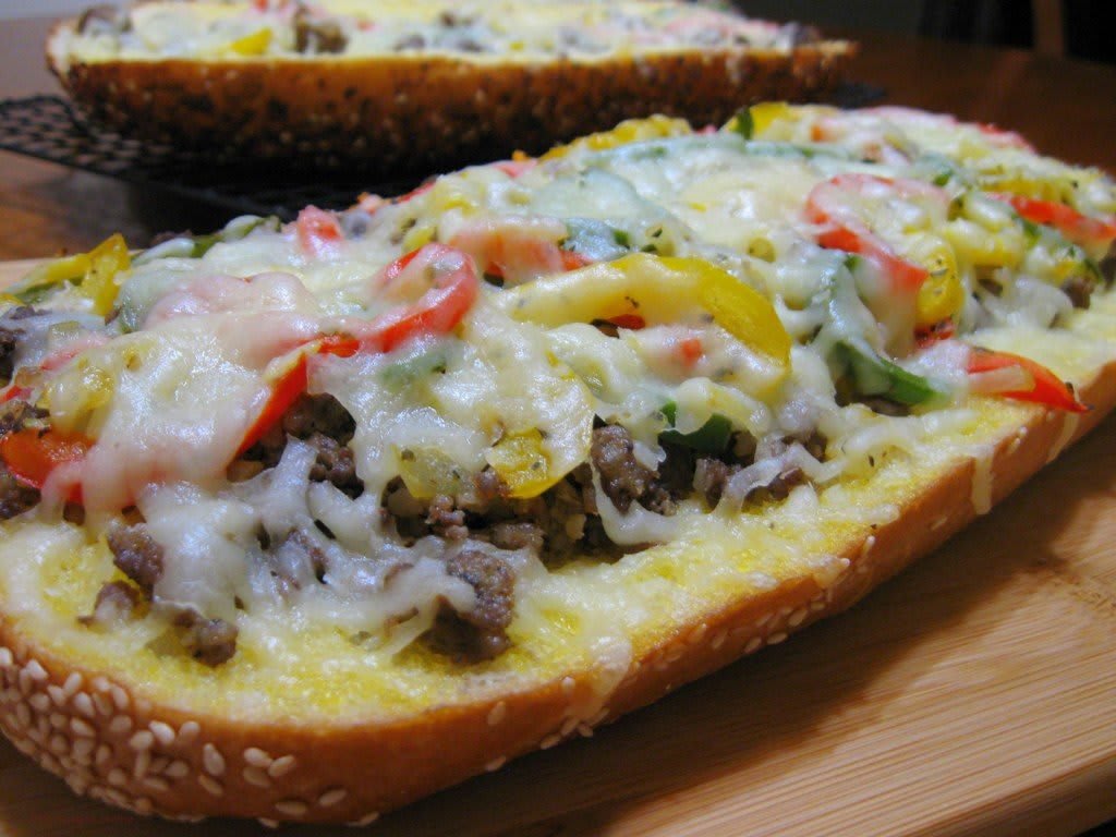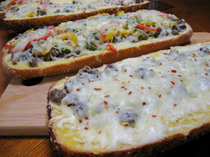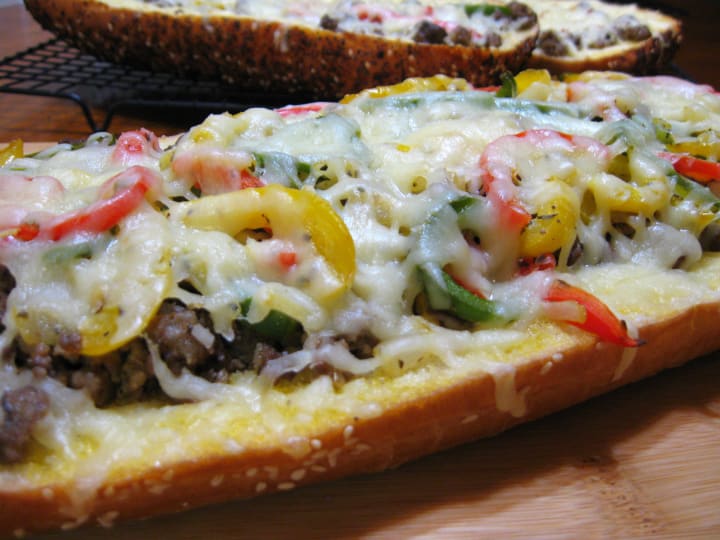 A delicious Italian loaf, soaked with homemade garlic butter, loaded with sausage, Italian seasoned sauteed bell peppers and onions, and then a bubbly layer of cheese. Who wants some?