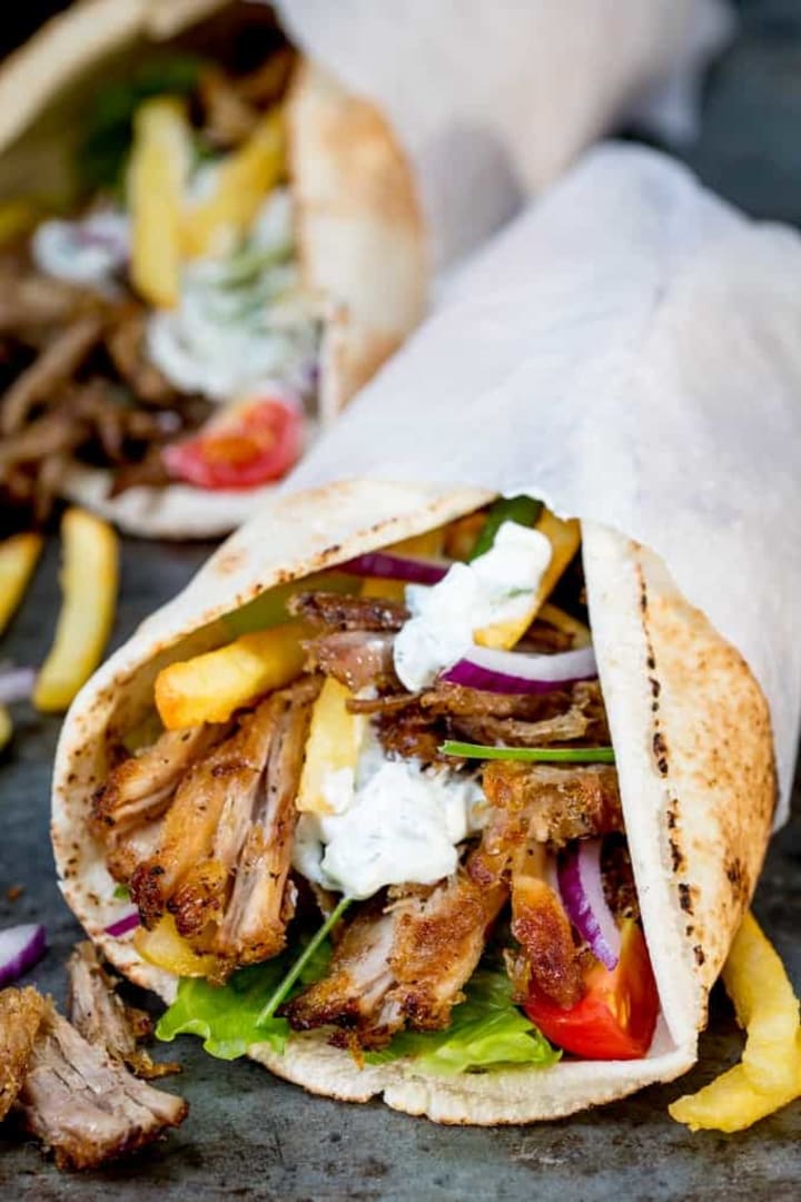 Gyros is another popular Greek street food that is prepared with pork, chicken, lamb, or veal. It is cooked on a vertical spit. The meat is sliced in thin shavings and placed in pita bread with sauces like tzatziki and with vegetables like tomatoes, onions, lettuce, and cucumbers.