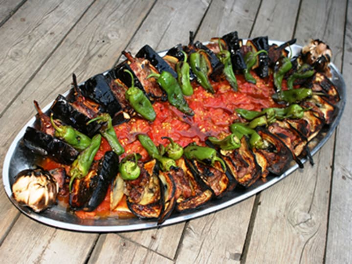 Tokat kebab originated from Tokat. It is prepared with lamb shanks, potatoes, eggplant, tomatoes, green peppers, garlic, and olive oil. The meat is cut into chunks, large slices of eggplant, and thick vertically cut slices of tomatoes and potatoes. The ingredients are placed in a baking dish or skewered and drizzled with oil then roasted until tender. The dish is roasted under a whole bulb of garlic. Traditionally it is made in special clay ovens.