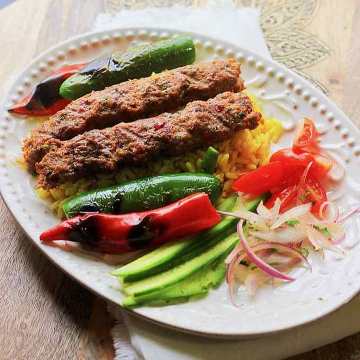 Adana kebab is a popular skewered meat dish named after one of the most famous kebab cities, Adana. The kebab is prepared with ground lamb and tail fat kneaded together along with garlic, onion, paprika, and hot red pepper flakes that give it a deep red color and spicy flavor. The meat is placed around large, flat metal skewers and grilled. It is traditionally served on a platter over flatbreads, peppers, and tomatoes or placed into pita bread along with a salad with parsley and red onions.