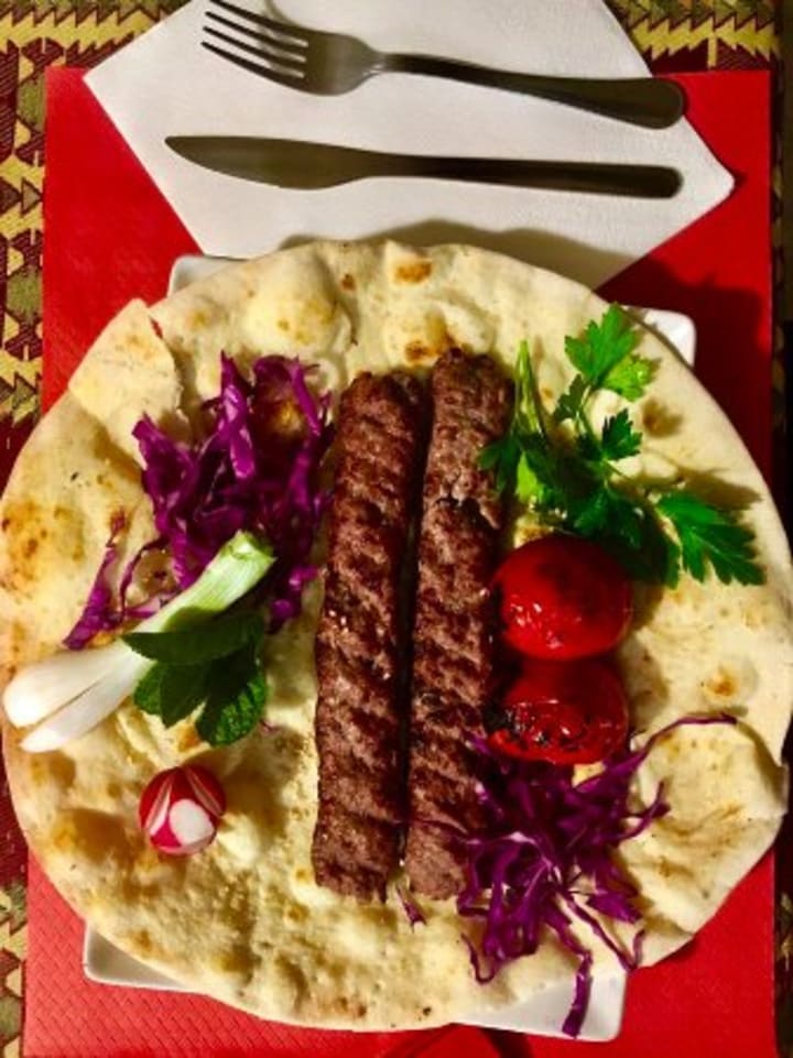 Nan-e-kebab is a term that refers to a variety of dishes that are a combination of kebabs and traditional Iranian bread. The kebabs are made with lamb, beef, or chicken. They're accompanied by lavash, a flatbread thought to be the oldest Middle Eastern bread. The kebabs are accompanied by fresh or grilled vegetables and a glass of doogh, traditional Iranian yogurt.