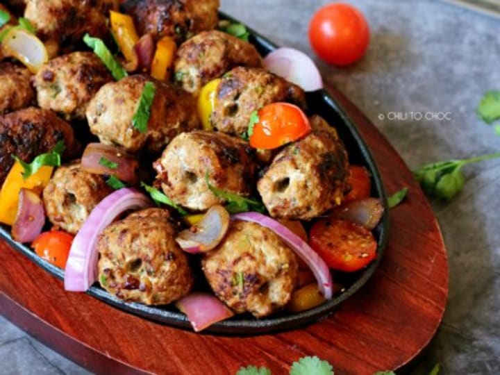 Gola kebab is made with skewered meatballs. The meatballs are prepared with mutton, onions, different herbs and spices like red chilli powder, turmeric, cloves, cardamom, cinnamon, coriander leaves, mint leaves, and ginger garlic paste. Once the meatballs are shaped they are fried or baked golden brown. They're accompanied by chutneys and served as an appetizer or side dish to vegetables based dishes.
