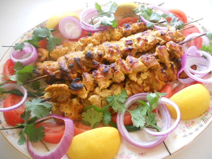Kalmi kebab was influenced by Mughlai cuisine and is particularly popular in Punjab. The dish is prepared with chicken drumsticks that have been marinated and shallow-fried on high heat until deep golden brown. The meat can also be prepared in a tandoor oven. The meat marinade is a mix of yogurt, cream, ginger, garlic, lemon juice, turmeric powder, cashews, jeera powder, garam masala, red chilli powder, and black pepper. It is usually served as an appetizer with pickled onions, rice, or chutney on the side.