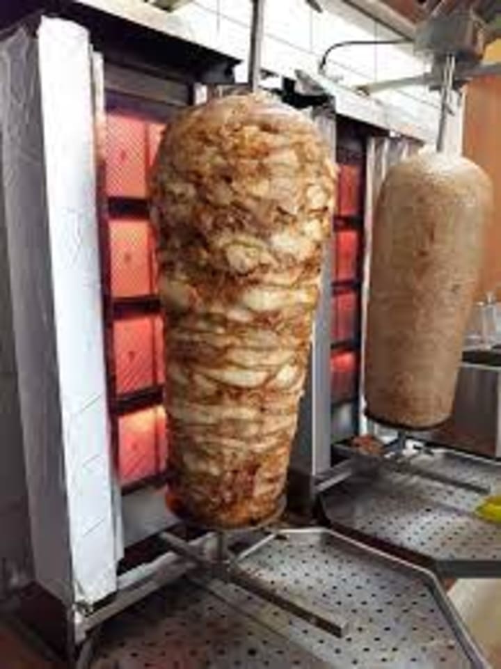 Shawarma is meat that has been marinated and spit-roasted. Its origins go back to the Ottoman Empire era. It is made with lamb, chicken, beef, turkey or a mix of meats. Then slow-cooked for hours and basted with their own juices and fat.