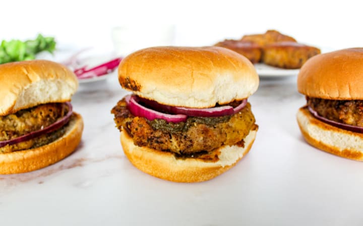 Bun kebab is a traditional Pakistani street food that originated in Karachi. The kebab consists of a bun filled with shami kebab, chutney, raita, slices of onion, tomatoes, and cucumbers. The filled bun is seared until golden and crispy.