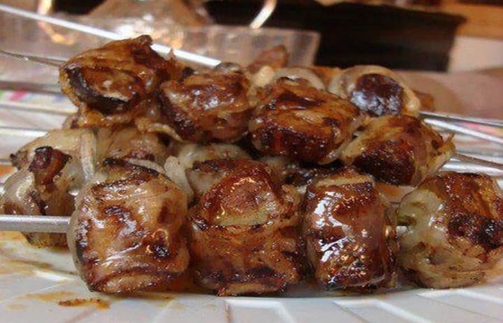 Mtsvadi is a skewered shish kebab prepared with ground pork, mutton, or veal. The meat is marinated in a mix of lemon juice, pomegranate juice, tarragon, salt, pepper, and chopped onions. It is made outdoors over an open fire and served with tkamali plum sauce, raw onion rings, sliced tomatoes, and pomegranate seeds.