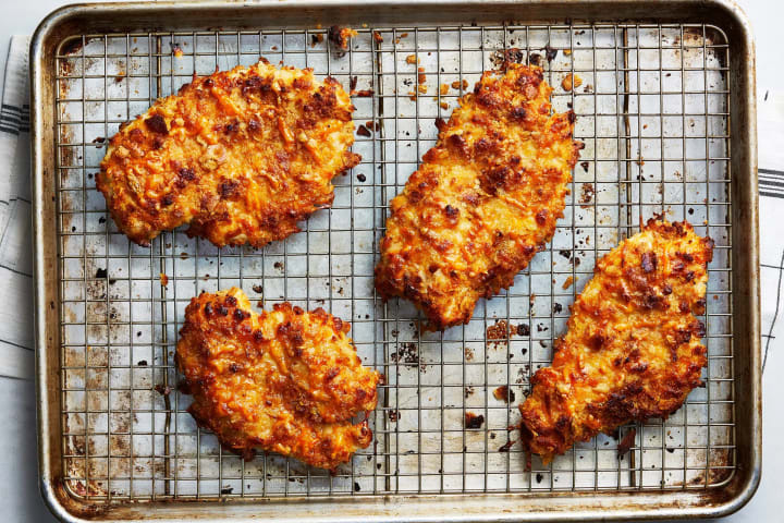 Tender chicken breasts coated in a cheesy-crunchy combination of Ritz crackers and Cheddar? Sign us up. A quick dip into a mixture of sour cream, egg white and Dijon before breading helps keep the chicken moist while baking. It seems right to serve this dish from Eric Kim alongside a pile of Tater Tots, but a crisp green salad would be nice, too.