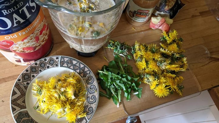 First, remove the yellow DandyLion petals off from the green part of the flower head. Then simply put all the ingredients together in a blender and bBBBBBBRRRRRRRRR for about two minutes on high.