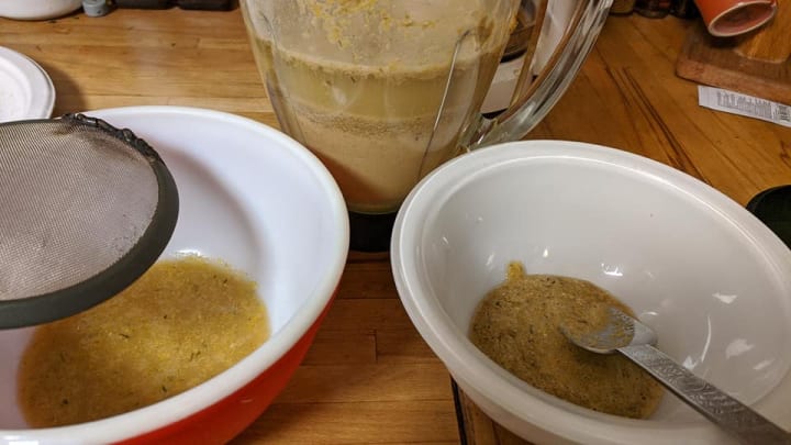 When a lot of the liquid has fallen through into bowl B and the "Oak Gunk" left in the strainer is visibly thicker, put it into bowl A. Repeat this process through all of the "Oat Cream."