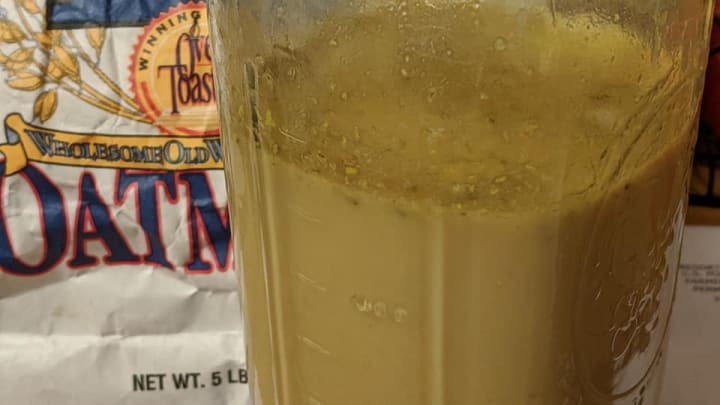 After some time, the tiny Oat and DandyLion particles will float to the top, and the larger pieces will sink to the bottom, leaving "Oat Water" in the middle and "Oat Cream" at the bottom.