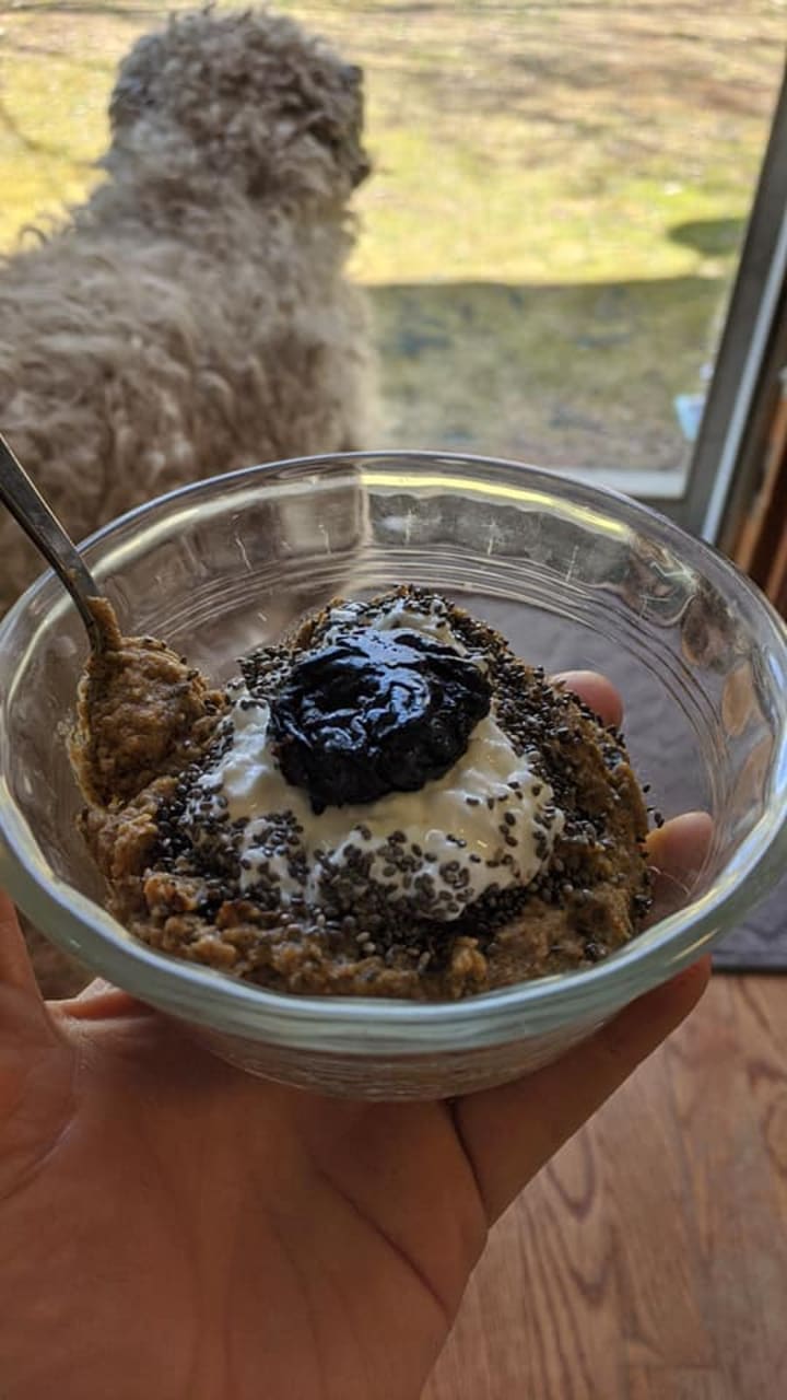 You can heat it up and make a nice Porridge! Here, I mixed in Prunes and Chia Seeds. It's ready to eat already ('cause it's soaked) but it heats up really quick. Then I put a dollop of Cottage Cheese and another prune on top, and sprinkled more Chia Seeds on! Super Healthy!!!