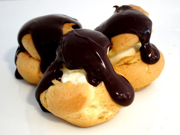 Profiteroles are chocolate-covered puff pastries. They’re filled with whipped cream, custard pastry cream or vanilla ice cream.