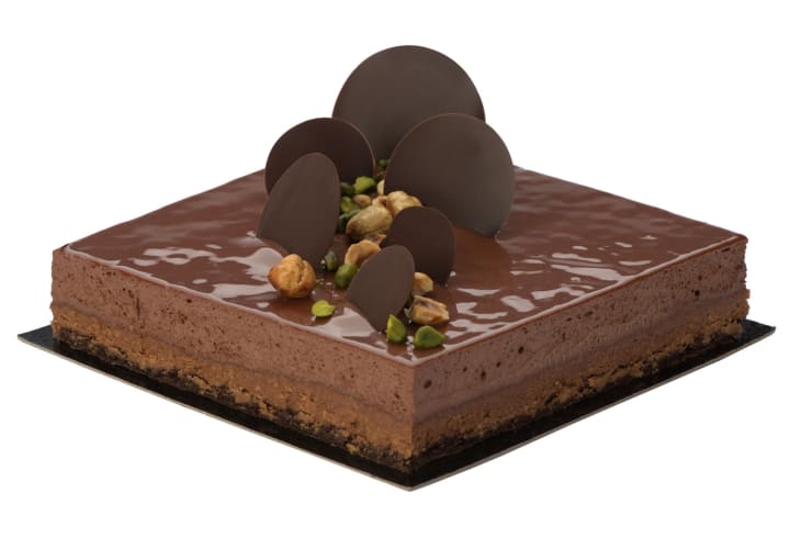 Royal is a classic dessert. The base of the cake is dacquoise, an almond meringue topped with crunchy praline cream consisting of melted chocolate, thin and crispy crepe dentelle biscuits, and praline paste.