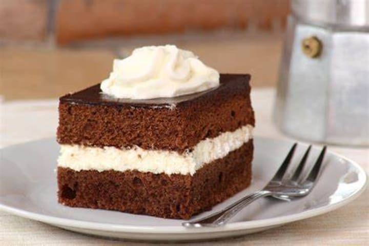 Wuzetka is a traditional cake originating in Warsaw. The cake consists of chocolate sponge cake filled with whipped cream and covered with chocolate icing. The cake is made with flour, eggs, sugar, butter, cocoa powder, rum, and plum jam, The icing consists of butter, milk, and dark chocolate and is poured over the cake.
