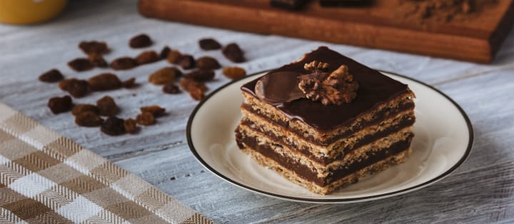 Torta Garash is a popular dessert consisting of five walnut sponges layered with dark chocolate. The whole cake is covered with glistening chocolate icing or creamy ganache.