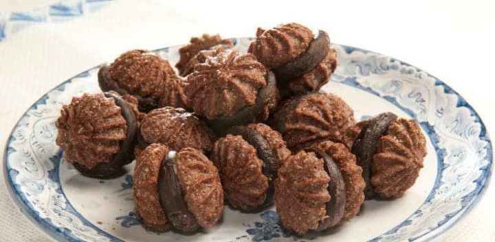 Baci di Alassio are chocolate hazelnut cookies originating in the Ligurian town of Alassio. The cookies are called baci meaning kisses. They consist of two small hazelnut cookies with a rich chocolate ganache between them so the cookies look similar to lips sending a kiss.