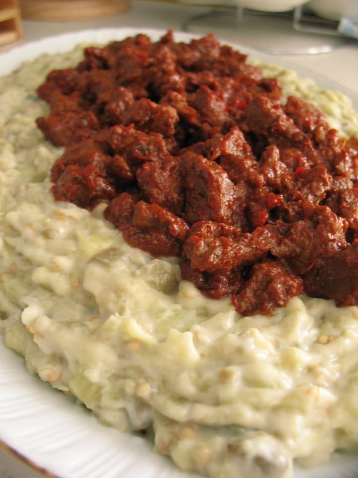 Hünkar beğendi is a traditional Turkish lamb stew that is served on top of a creamy roasted eggplant puree. The eggplant puree is thickened with milk and cheese. The whole dish is sometimes topped with a tomato based sauce and garnished with freshly chopped parsley.