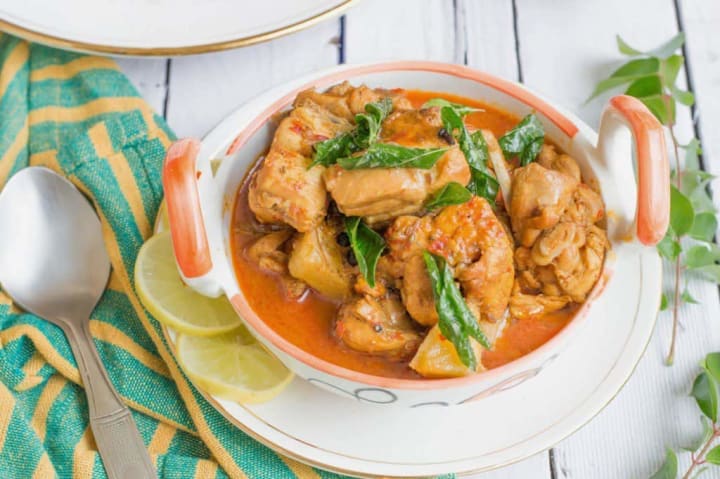 Kari ayam is a chicken curry that is popular in Malaysia and Indonesia. The curry is prepared with pieces of chicken, onions, garlic, ginger, ghee, tomatoes, coconut milk, and spices like anise, cinnamon, curry leaves, pandan leaves, lemongrass, chillies, cumin, turmeric, and fennel.
