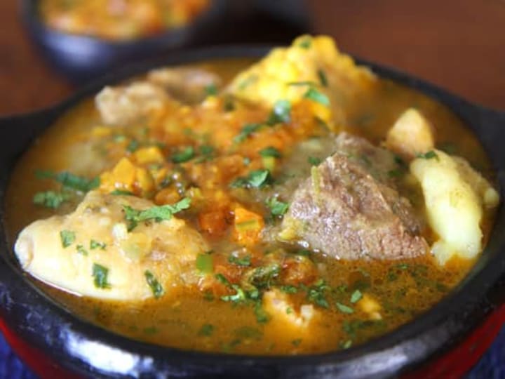 Traditionally, it is served with white rice, spicy aji sauce and avocado slices. The thick broth makes the stew flavorable and it is garnished with fresh coriander, onions, and a sprinkle of lime juice,