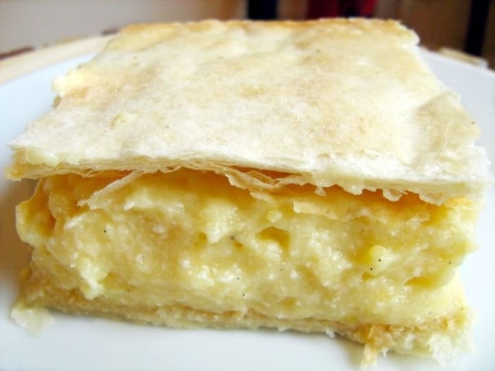 Kremes means creamy. This dessert is prepared with two layers of puff pastry that are held together with smooth pastry cream. The pastry cream should be light and airy and the top dusted with powdered sugar. Traditionally when served its cut into large rectangular, slices.