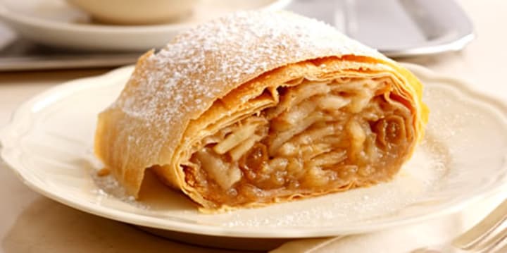 Apfelstrudel is a traditional pastry that is made with thin layers of dough then filled with apples. It is baked until the dough is golden and the apples are cooked. The dessert is prepared with puff pastry, diced apples, lemon juice, chopped walnuts, and raisins.
