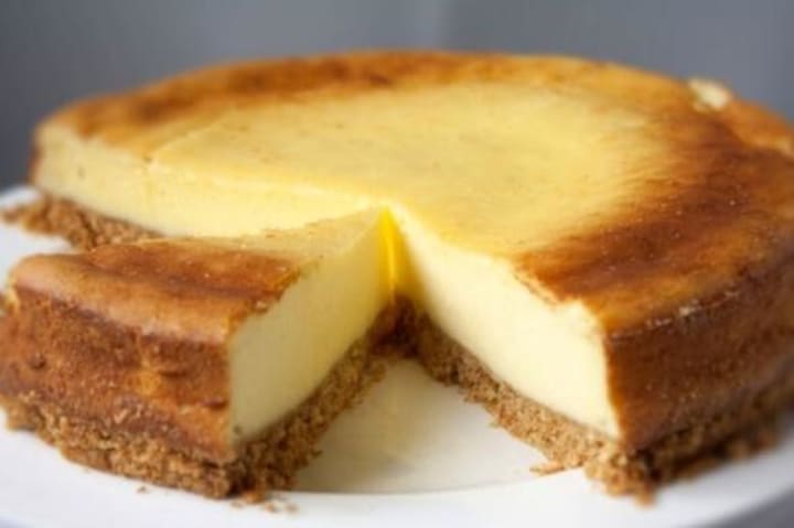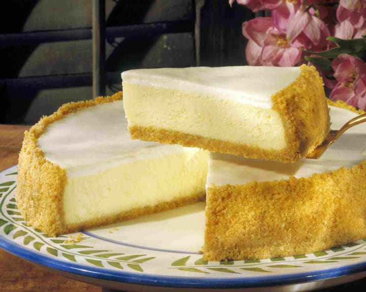 The cheesecake is prepared with heavy cream, eggs, vanilla, cream cheese, and (optionally) sour cream, while the base usually consists of a sponge cake crust or graham cracker crust.