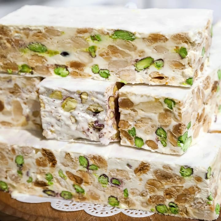 Toronne is Italian nougat that is made with toasted almonds but can be studded with walnuts, peanuts, hazelnuts, or pistachios.vToronne has a soft, chewy texture and is sold wrapped in flavorless edible wafer paper.