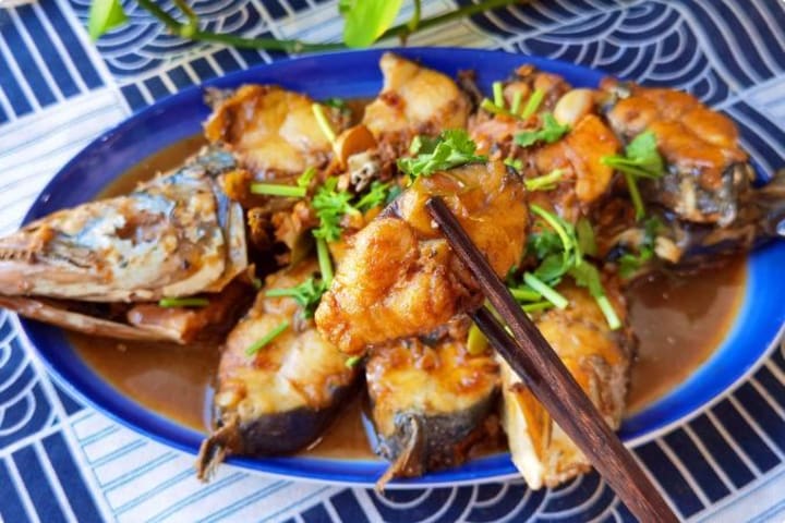 Finally, uncover, increase the heat to reduce the sauce, and garnish with cilantro or chopped scallions. The fish will be infused with the rich sauce—deliciously savory and perfect with rice!