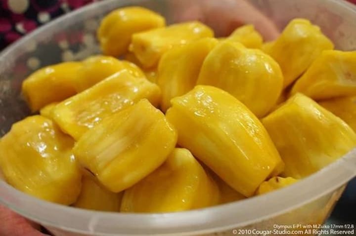 M picked one in the supermarket that day. He had never had it, but when we were together, we had the courage to try. Facing such a huge monster weighing more than ten pounds, we started our first exploration. Cutting the big strange fruit open, we just remembered a dense white fiber before our eyes. The fibers were moist, and there seemed to be some secretion. We tried and found that it was sticky and astringent. We looked at each other in speechless despair, wondering where the jackfruit got its good reputation. After an in-depth study, we found that the pulp was discontinuously distributed piece by piece and buried in dense and long fibers. So we started to look for the pulp with our bare hands, just like hunting for treasure in a tropical jungle unarmed. The long fiber was the rattan all over the space, and the hidden fruit fresh was the treasure buried by forty thieves. It was not much at first, but soon we felt that our hands were stuck with fibers and could not be opened. We had to put a wet cloth aside, wiped our hands from time to time, then continue to fight. When we found a clue, we dig out a large piece smoothly. Then we enjoyed the delicacy! Well, what the experience the taste of the flesh gave us was far less than the process of treasure hunting. It was even more strong when half of the pulps were dug out that it became more and more difficult to find treasures in the jungle. This moment I called that I found one, and after a while, he declaimed he found one. We made up a story of ants while hunting for treasure and announced the complete elimination of the jackfruit after finally searching with both hands. We felt unwilling facing such a huge and messy outer shell—how could it be useless with half of the volume?
