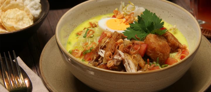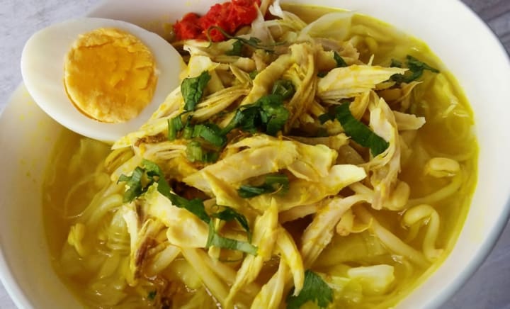 Soto medan mixes chicken or beef in a creamy broth with coconut milk and flavorings like galangal, turmeric, ginger, and coriander. The meat is cooked and shredded before it is added to the broth. The dish comes with condiments like boiled eggs, fish cakes, prawn crackers, potato fritters, or fried shallots. This dish originated in the city of Medan in North Sumatra where it is the signature dish.