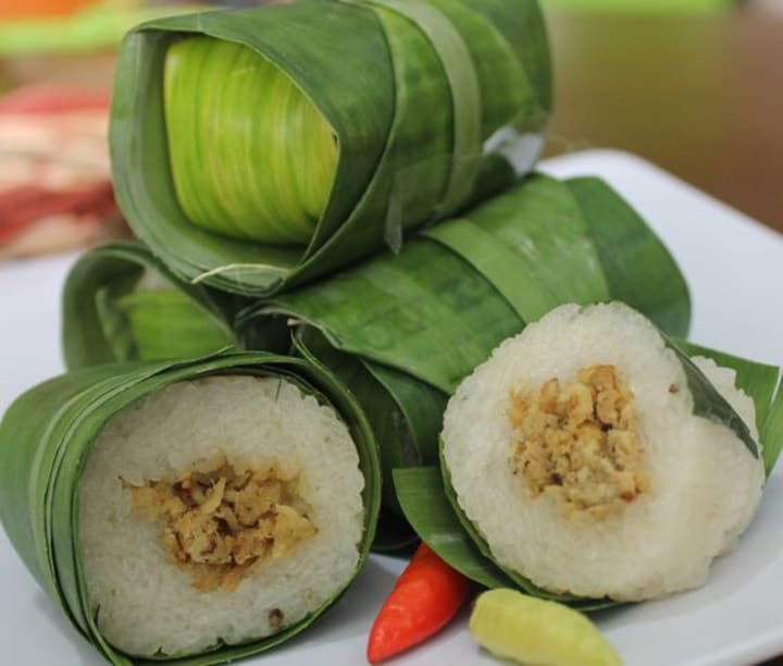 Lemper is a savory snack that is prepared by stuffing glutinous rice with seasoned shredded chicken, abon (meat floss), or fish. Then rolled into a banana leaf. The version with chicken is called lemper ayam and semar meridem is a version with shredded chicken and glutinous rice wrapped in a thin omelet.