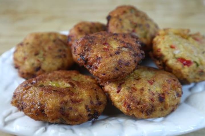Perkedel are fried patties that are prepared with ground meat, ground corn, minced fish, or mashed potatoes. They ingredients are combined with finely chopped scallions and pepper, then formed into patties and dipped in beaten eggs. They are fried until golden brown.