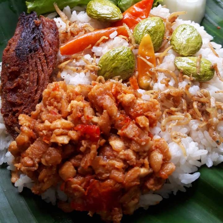Nasi liwet is a traditional rice dish that originated in Solo, Central Java. Rice is cooked in coconut milk with chicken broth and seasonings like bay leaves, and lemongrass. The rice it topped with shredded chicken, omelet, anchovies, chili peppers, and different vegetables.