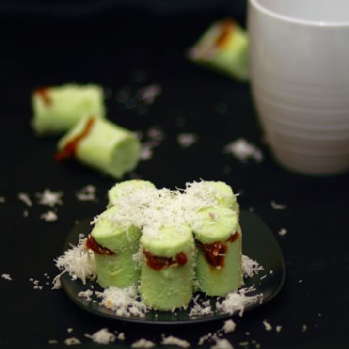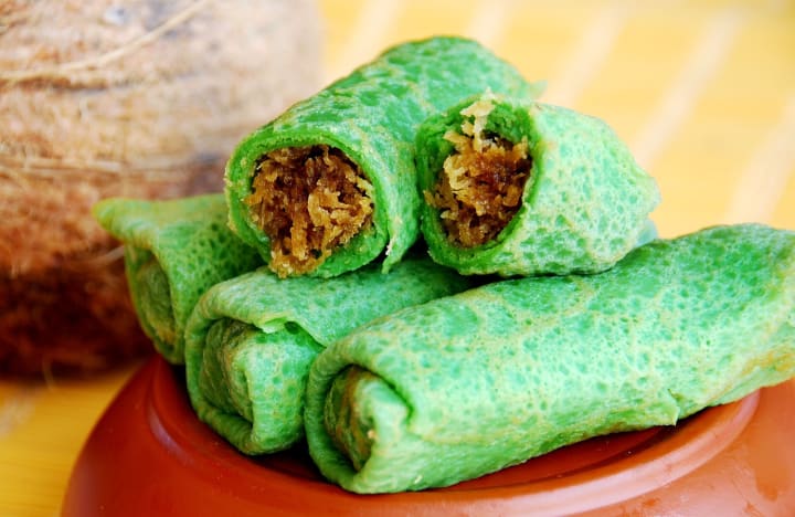 Dadar gulung is a traditional dessert that is consists of a thin rice crepe filled with grated coconut. The pancake batter is infused with pandan leaves for flavored and a vibrant green color. When baked, the crepes are filled with a combination of freshly grated coconut, cinnamon, and dark palm sugar.