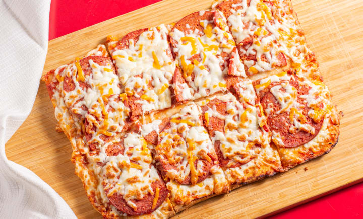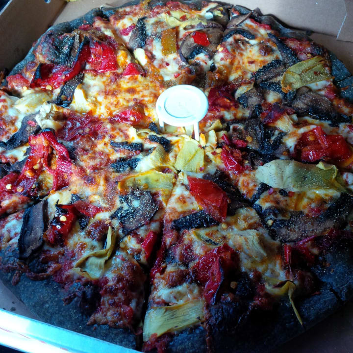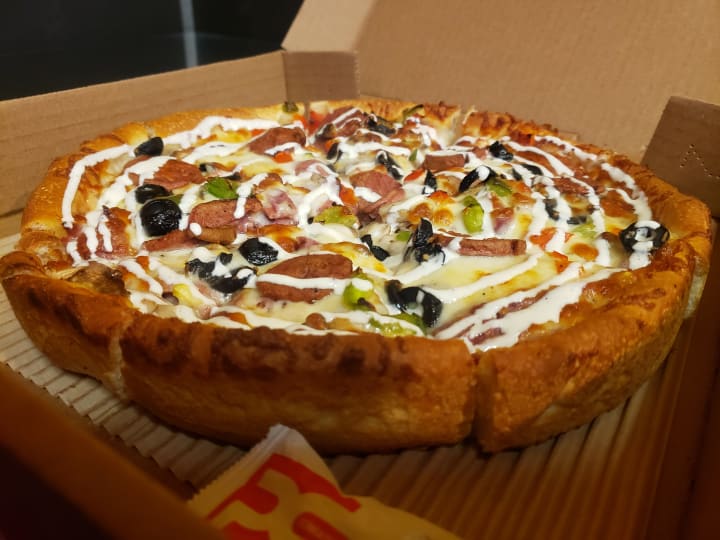 You can customize your pizza by choosing ingredients and enjoy mouthwatering Pepperoni Pizza, Buffalo Pizza, or hot chicken pizza in the building which is shown from the outside with blue sunny sky in the background, and if you are a vegan you can find options like spinach pizza, margarita pizza or mushroom pizza, and also have gluten-free pizza for allergic and have dessert like brownie and coke for a drink.