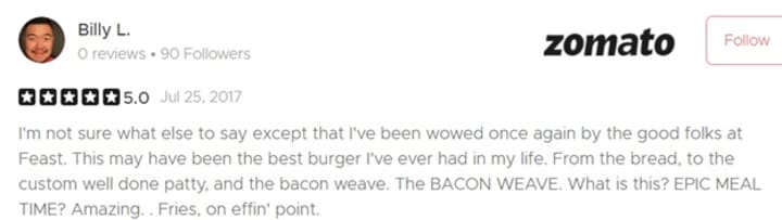 You can come here because it is recommended for family dining. That will say it is a memorable visit. Service is perfection, and the food is impeccable. You should eat a fantastic burger from Feast a couple of times! The meat patties are so freaking incredible, old fashion homemade style! However, it would more perfect if the price. Tuesday is twenty Dollars, beer and burger night. Indeed you have been to a lot of burger places—the best Burger for Ever. Straight up, no kidding. Fantastic. The food is outstanding; the atmosphere is warm and inviting; the service is excellent. They deserve five stars for sure.