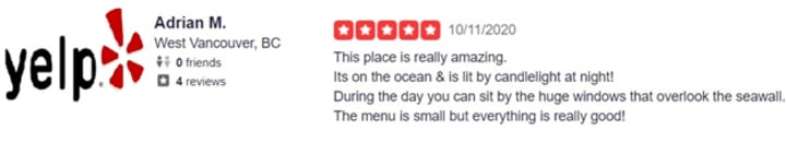 An excellent beach restaurant in West Vancouver, BC, Canada. Excellent views. Good service. We are especially fond of the outside dining area, which is warmly heated by heaters overhead and displays beautiful scenery through the glass panes. Food is tasty, presentable, and in the right portion, the rare blue steak you must have is one of the best! Even the burgers are the best that you have had. And when you go, you must try the crab yuzu roll! Every customer has eaten there several times, and they are always well pleased.
