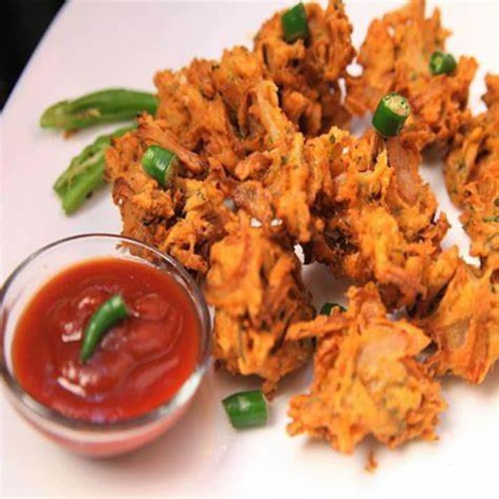 Pakora is a savory, deep-fried Indian snack made with chunks of vegetables such as potato, cauliflower and eggplant, or meat of choice, which is then dipped in chickpea flour, seasoned with turmeric, salt, chili, or other spices, and deep-fried in ghee. It is a quintessential Indian snack, easily found on numerous street corners and most popular during spring, when the locals choose to celebrate the monsoon season by eating fried foods.