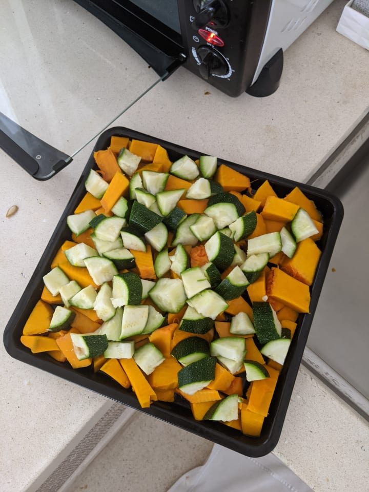 Chop up pumpkin and courgettes into cubes. Place in the oven for 200 degrees 40 minutes.