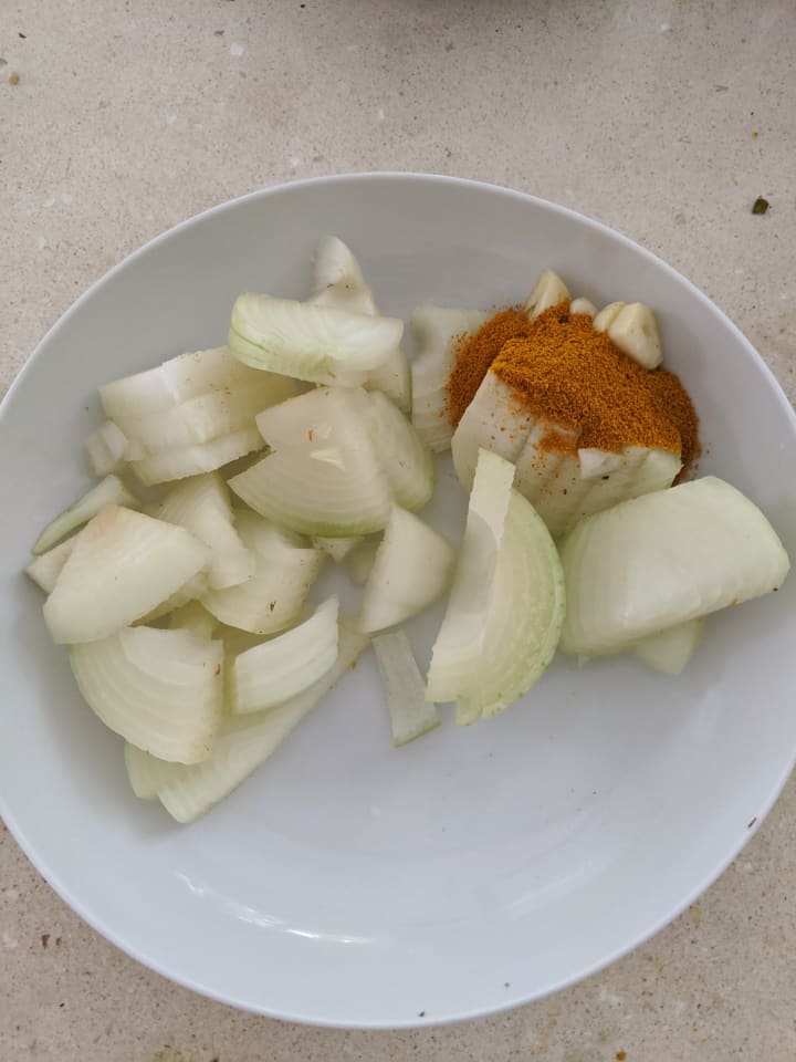 1.5 onions (chop up), 2 garlic cloves, 1/2 cup of think coconut milk, 1 teaspoon turmeric power.