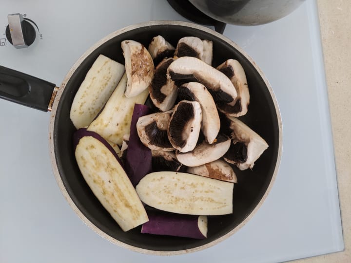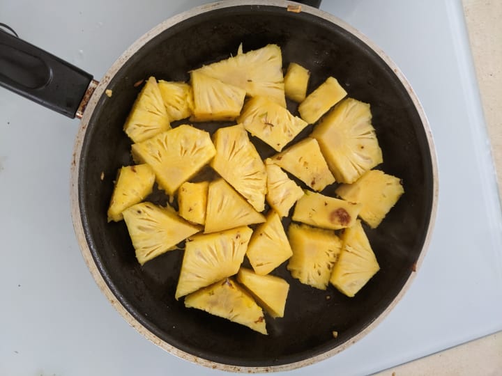 Chop up the rest of the fruit & vegetables, 1 Fresh pineapple 1.5 Onions, 6 Large mushrooms, 2 Pepper (1 red, 1 green), 1 Egg plant, 2 garlic cloves and fry until cooked (fry them however you like it cooked and once cooked place them all into a large saucepan, cook them separately if needed as there is a lot of veg.)