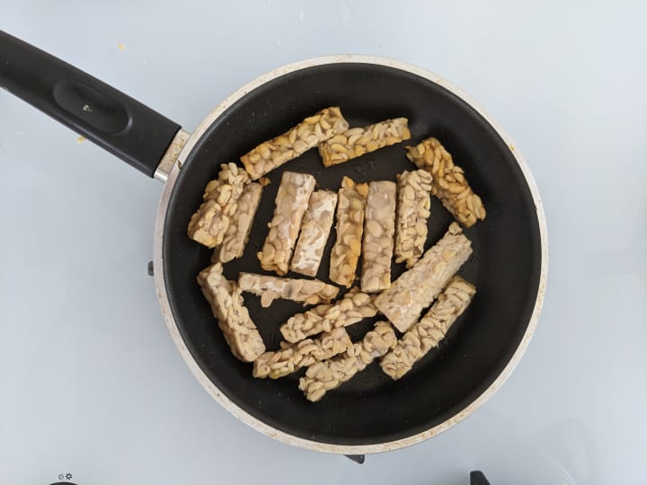 Cut the 1 Block of tempeh into strips and fry until golden brown on it's own.