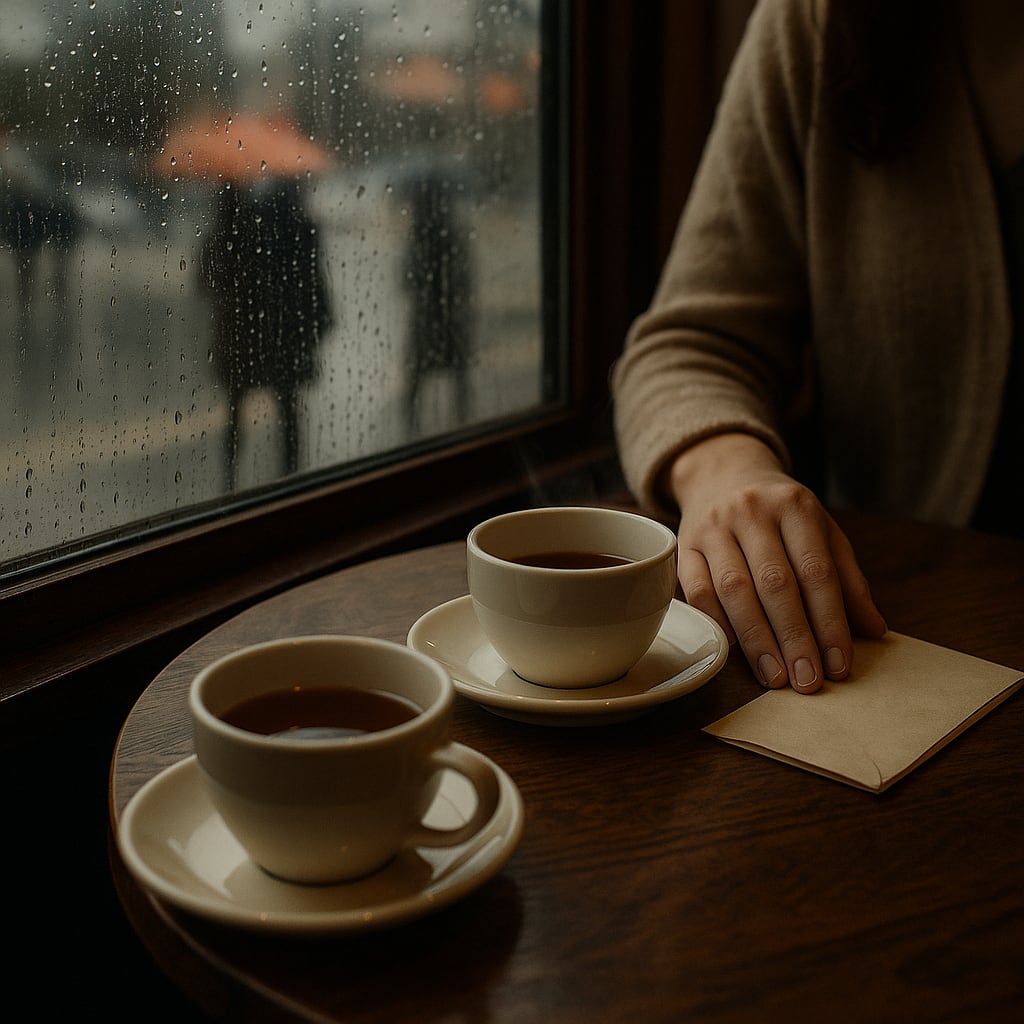 She stared out the window. Raindrops chased one another down the glass, blurring the world outside into watercolor shadows. Pedestrians scurried beneath umbrellas. A child splashed in a puddle. Life moved on, unaware of the quiet drama unfolding by the second table from the left.