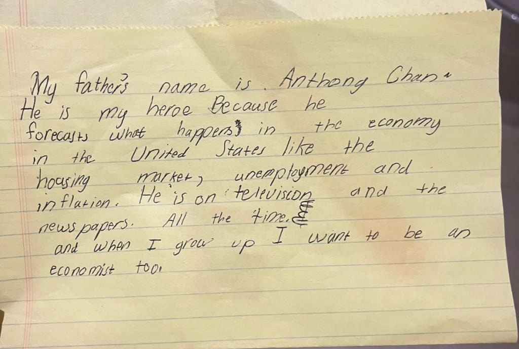 "Dad, I found something incredible!" Catherine exclaimed, her eyes shining with excitement. She handed him the folded paper, her voice trembling with emotion. "I wrote a letter when I was little about how you're my hero, and I wanted to be an economist just like you."