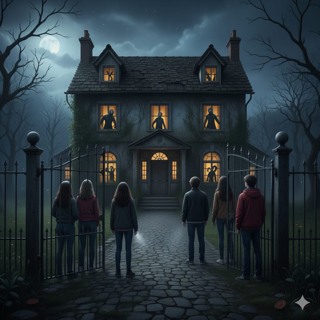 It was a crisp winter night. The full moon hung bright in the sky with a hazy glow around it, casting an eerie light over the dark neighbourhood. Luca, Lucia, Alis, Kile, and I, Helen, stood on the street in front of the gate in the waist-high stone wall leading up the path to the worn-down house that everyone said was abandoned and haunted. It was the infamous haunted house, known for its chilling tales and ghostly sightings, things moving without reason and lights going on and off with no one in the room.